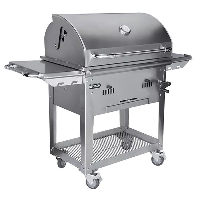 The Bull 30-Inch Bison Premium Freestanding Charcoal Grill offers a high performance freestanding charcoal grill alternative for your perfect outdoor kitchen. The 30-inch Bison grill is housed inside premium 304, 18 gauge stainless steel to ensure durability and longevity while the updated vent and gasket system offers greater temperature control and efficient oxygen flow throughout the firebox. The thick stainless steel grates offer high surface area to create the professional style sear marks everyone desires while the adjustable charcoal bed adds to the versatility of a unit that specializes in both low and slow BBQ grilling and high heat searing. The dual lined grill hood guarantees a flavor lock and great heat retention during cooking while keeping grillers safe from the charcoal's smoke. The Bison grill cart includes 2 stainless steel side shelves to offer areas for food prep while the 4 heavy-duty casters make it much easier to move your grill from one place to another. Do yourself a favor and reward yourself this grilling season with a