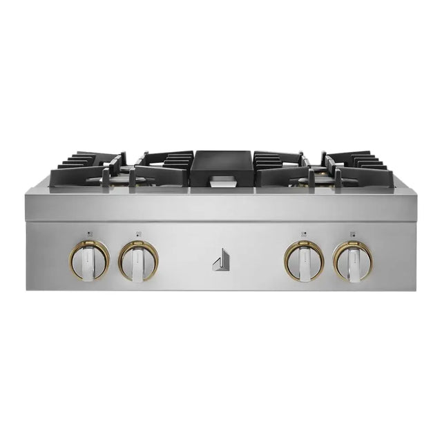 JennAir RISE 30 inch Gas Rangetop with 4 Sealed Burners, Cast Iron Grates, Halo-Effect Knobs, Electronic Ignition with Flame-Sensing Reignition, in Stainless Steel, JGCP430HL