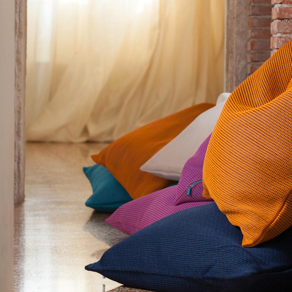 These Italian-made pillows are stylish, practical and fun. Four PVC threads are twisted into “yarn†that is then knit into a sweater-like fabric. This, in turn, is then used to make a cover that encases an inner polyester pillow in a contrasting color. The inner pillow is filled with polystyrene (Styrofoam) beads. Eye-catching that accepts no compromises. Ready for the outdoors.