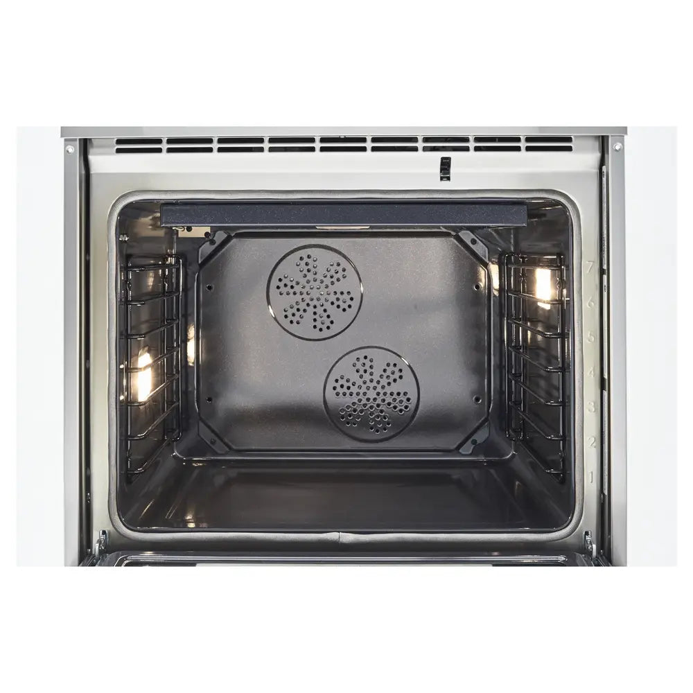 The soft-close oven door with edge-to-edge tempered glass is a masterpiece of European engineering and makes the oven door very easy to wipe clean. Convenient smooth-glide telescopic racks on 2 levels help loading and unloading the oven.
