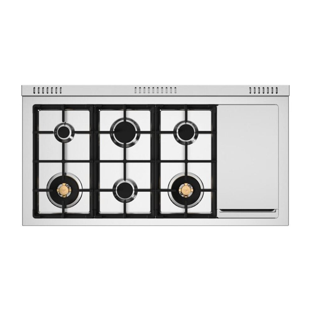 Bertazzoni signature stainless counter-deep maintop is designed to install flush with most kitchen countertops for a perfectly integrated look. Precise and flexible heating is generated through 6 Mono-bloc brass burners. 2 x 19000 BTUs power burners with dual ring of flame boil water in 6 minutes flat. The stainless steel electric griddle comes with a handy integrated cover.
