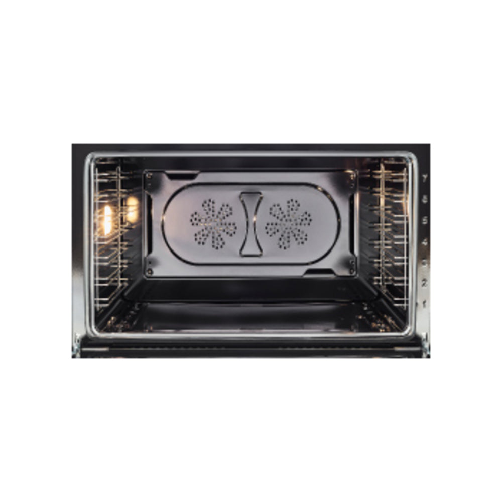 The soft-close oven door with edge-to-edge tempered glass is a masterpiece of European engineering and makes the oven door very easy to wipe clean. Convenient smooth-glide telescopic racks on 2 levels help loading and unloading the oven