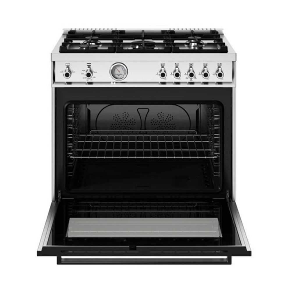 The 5.9 cubic feet oven cavity is the largest in its class, with dual convection fan for balanced airflow and even temperature baking and roasting on 7 shelf levels. The elegant large temperature gauge monitors the actual temperature in the oven. The extra wide infrared gas broiler is ideal for grilling and searing at high heat.