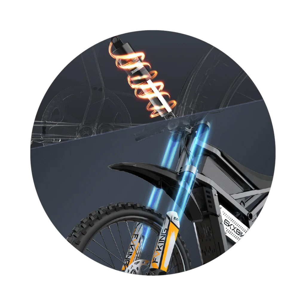 With its dual 52V/40Ah lithium battery pack, the EKX E6 powers up to an impressive 60 km/h and offers a riding range of 100–120 km on a single charge. Whether you're scaling steep inclines or enjoying long-distance rides, its brushless motor ensures high torque, efficiency, and control. Pair that with full front and rear suspension, plus off-road MTB tires, and you’ve got a ride that promises smooth handling even on rocky surfaces. Imagine the freedom to explore new heights with minimal fatigue.