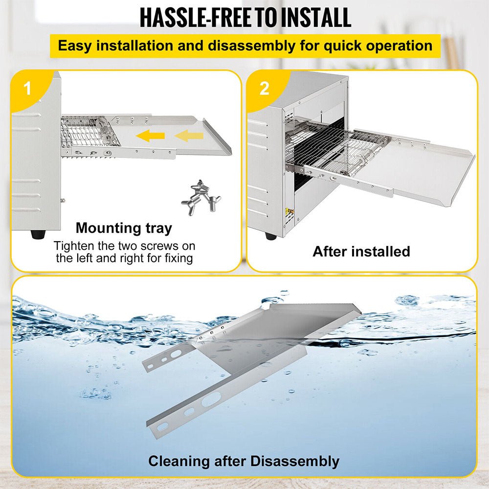 Constructed of stainless steel shell and conveyor belt that can withstand high temperatures while maintaining optimal heat loss prevention with a thermal insulation cotton top. Installation is a breeze as the conveyor belt and main body come preassembled, requiring only the rear support plate attachment to begin baking away. A one-of-a-kind choice for all your catering demands, make delicious pizzas with this portable countertop conveyor oven or explore new snacks like cookies, breads, sandwiches and more! Try out this efficient pizza oven today!