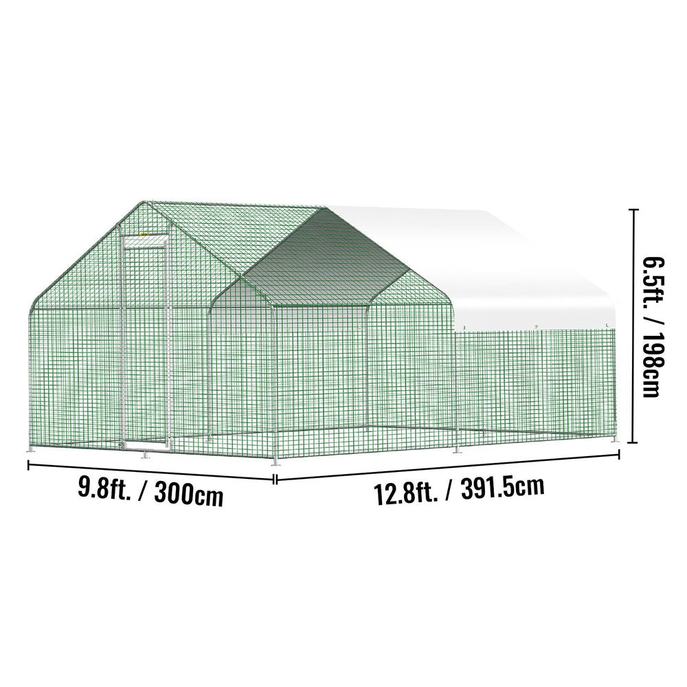 - The sun-protective, rain-proof and snow-proof tarp is excellent for outdoor use. In addition, it will protect the frame and wire from rust and corrosion so that it will be very convenient for you to clean the hen house. The walk-in poultry cage area can reach 125.63 sq. ft allowing the chicken to play and run comfortably against all weathers and outdoor elements.