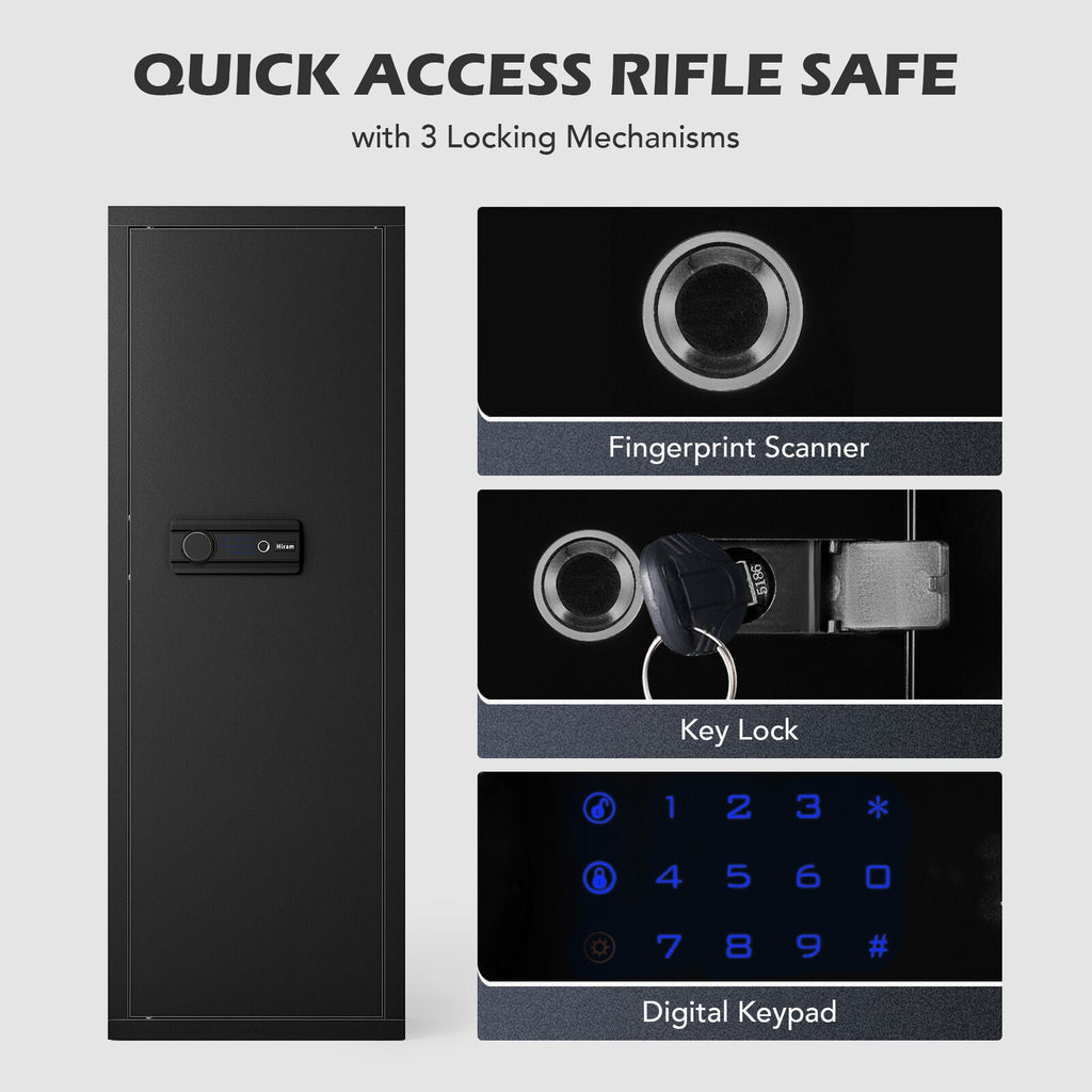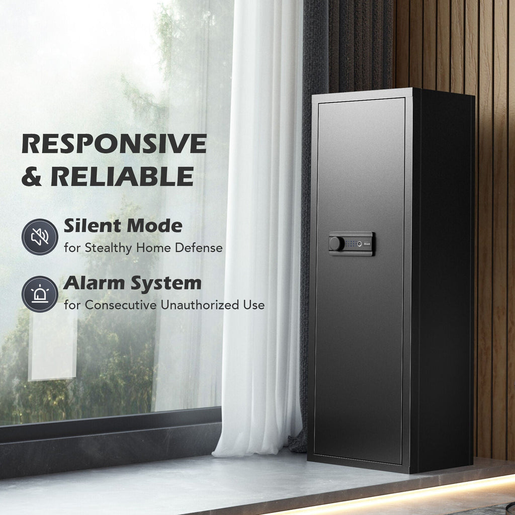 Protect your home firearms and keep your family safe with this Large Heavy Duty Steel Gun Safe! Our gun safe provides dependable protection with a high-tech multiple-lock system that includes both a fingerprint scanner and digital keypad for quickly gaining access when needed. It also features adjustable racks and shelves to customize your storage, while accommodating up to 6 long guns, 12 shotguns, ammo, scopes, and more.