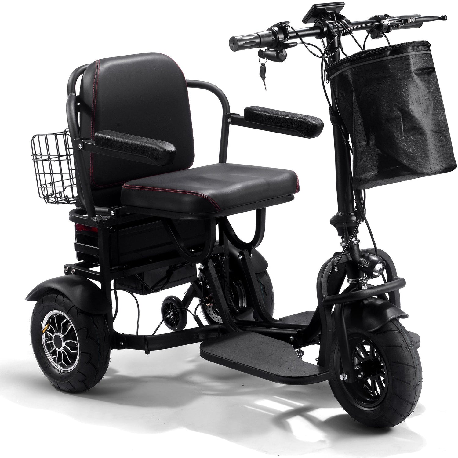 Comes standard with headlight, rear light, key start, 3 forward speeds (with additional slow 2 mph speed), reverse, dual rear disk brakes, comfortable seat with arm rests and backrest, front & rear baskets and large 11 inch air filled tires to provide a comfortable ride.