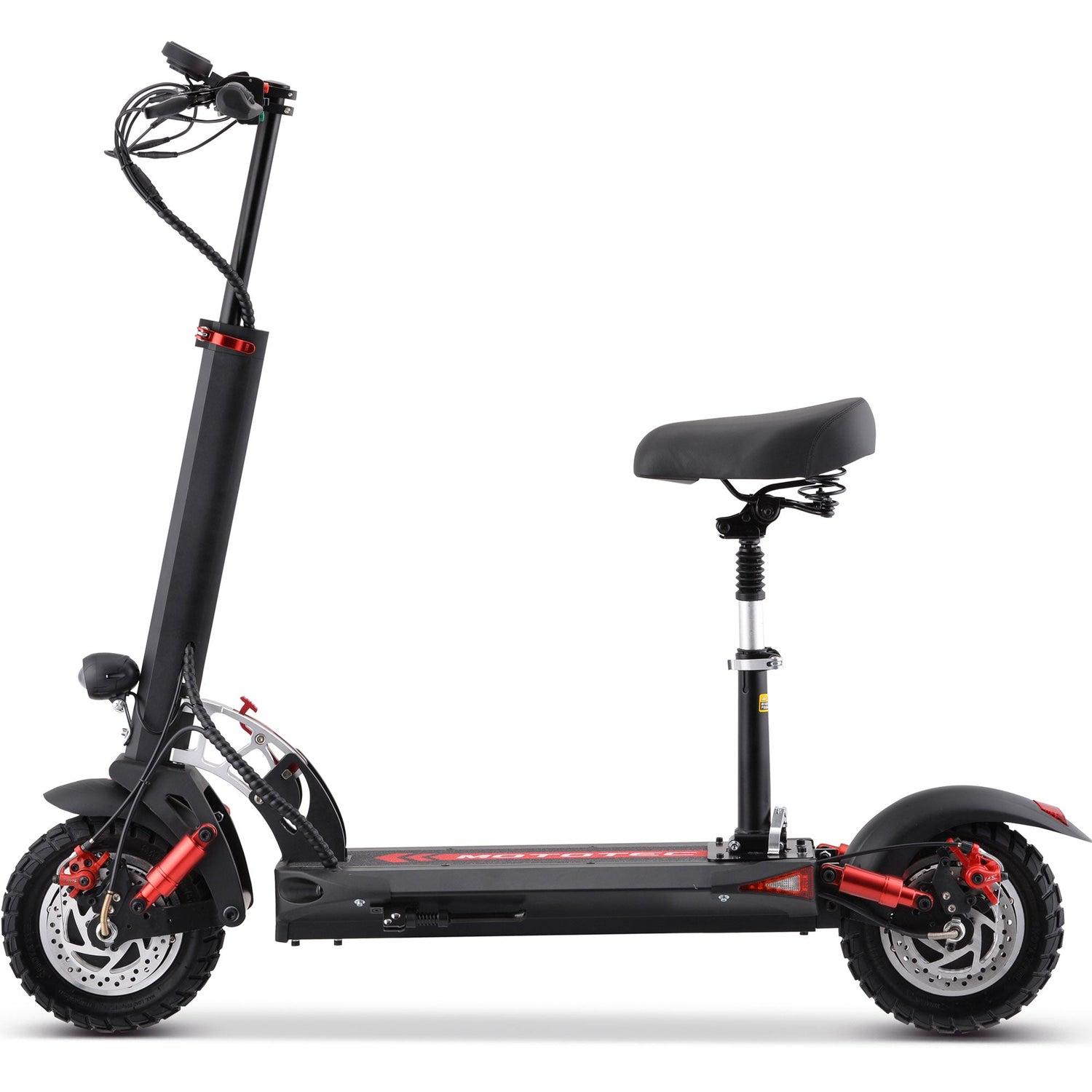 Introducing the new MotoTec Thor 60V 2400W Lithium Electric Scooter with Dual Motors! Comes standard with adjustable handlebars, dual front & rear suspension, foldable frame, front & rear disc brakes, LCD panel with speedometer, odometer, cruise control, usb charging socket and 9 adjustable speeds. Dual hub motors allow you to tackle any terrain, this is one of our most powerful scooters and it does not disappoint!