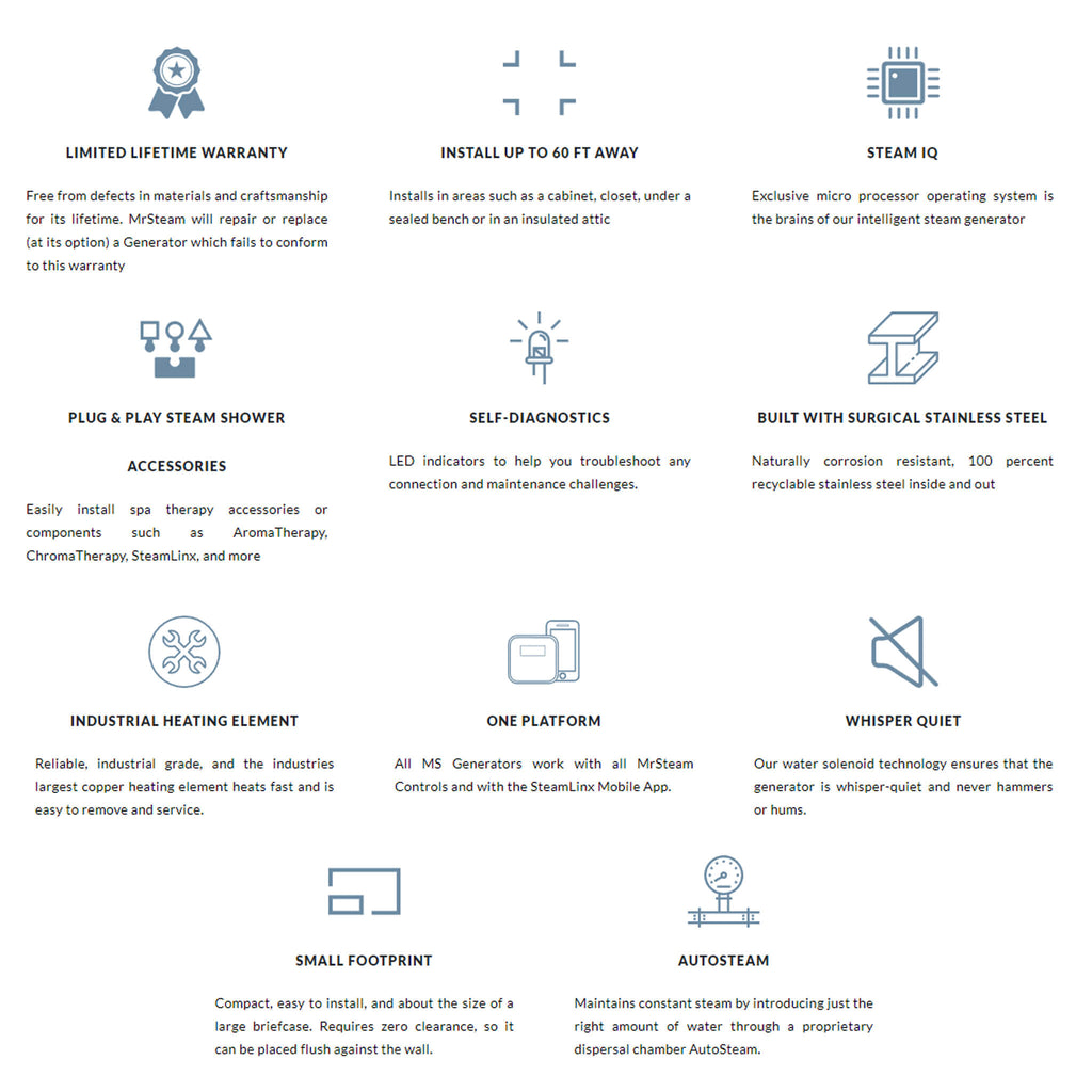 - Free from defects in materials and craftsmanship for its lifetime. MrSteam will repair or replace (at its option) a Generator which fails to conform to this warranty.