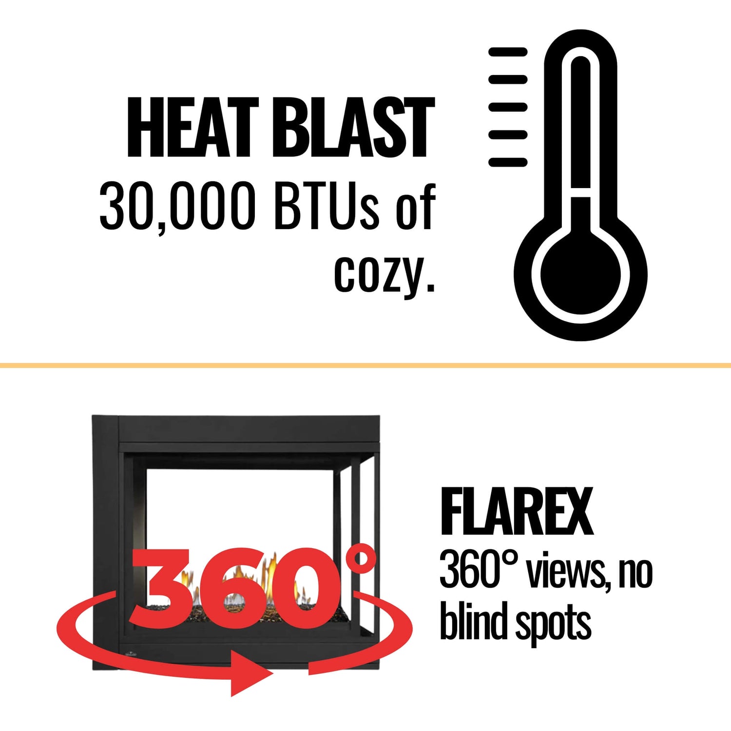 - Enjoy a stunning 360-degree view of the flames with its innovative peninsula design.