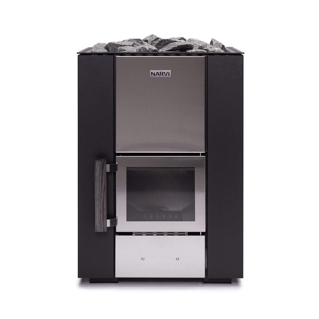 Upgrade your sauna experience with the Narvi Kuru Wood-Burning Sauna Stove. It creates a warm, authentic feeling that makes every session relaxing and enjoyable. Watching the fire through the glass door gives you a cozy, calming atmosphere you can't get with electric stoves. Its simple and stylish black steel design looks great in any sauna, and the wooden handles make it easy and safe to use.