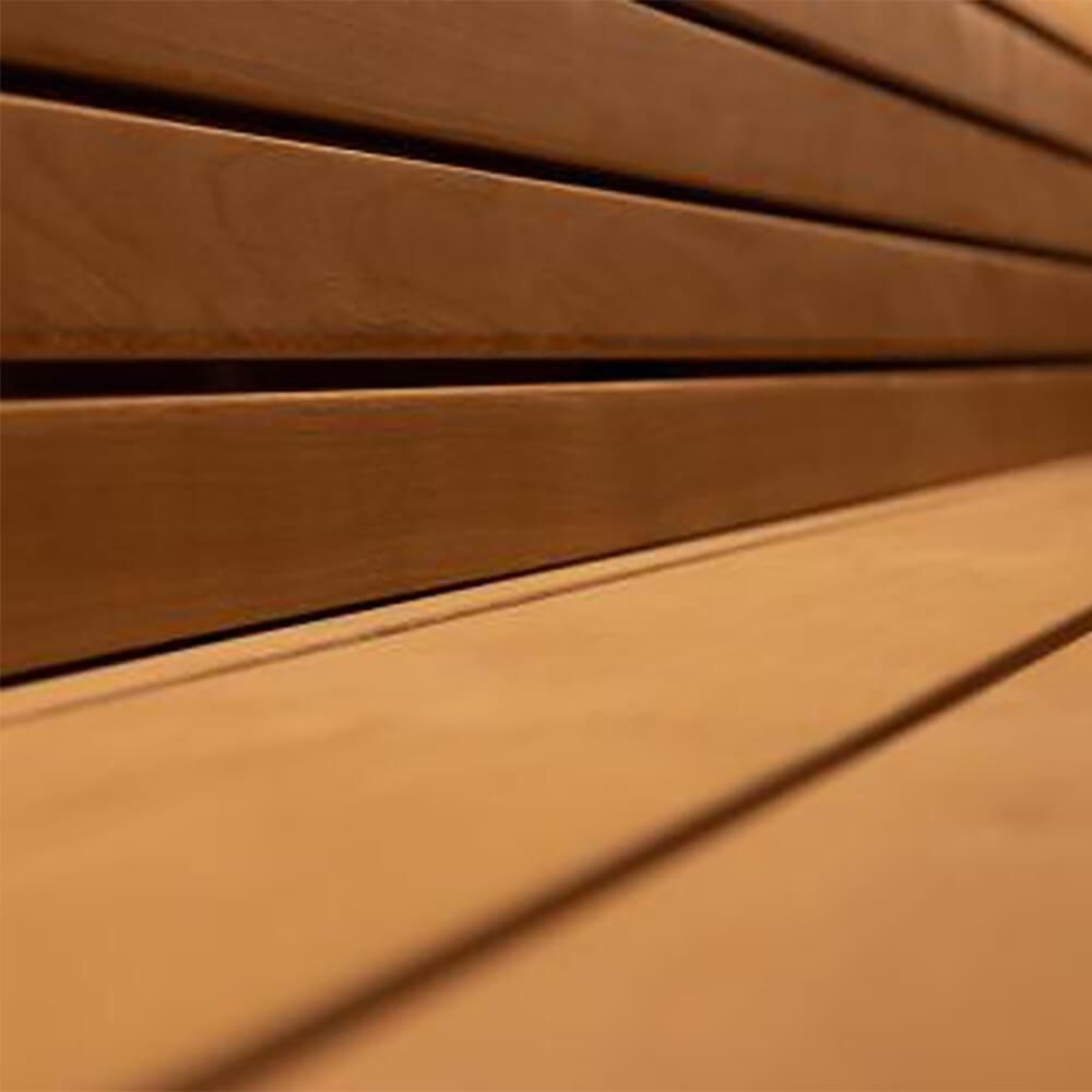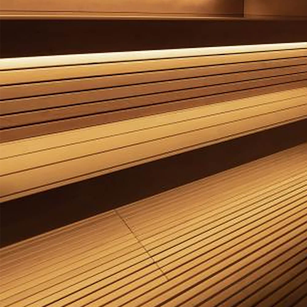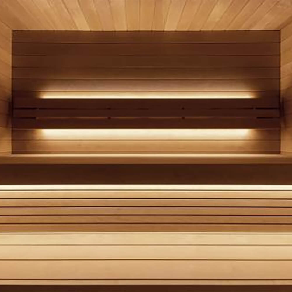 - Beautifully integrated LED lighting enhances the soothing ambiance of the sauna. With dimmable bar lighting behind the backrest and under the benches, you can set the perfect mood. Control the lighting easily with the Wi-Fi app or the included remote, ensuring your relaxation is always within reach.